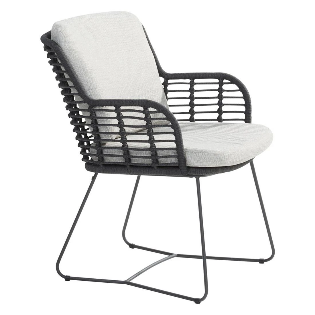 Das Gestell wird aus hochwertigem und rostfreiem Edelstahl hergestellt. Aufgrund des etwas höheren Eigengewichts, steht der Gartensessel dadurch besonders stabil und windsicher auf der Terrasse. Die Sitzfläche besteht aus modernem Rope-Geflecht. Die Bezüge sind aus dem Marken-Outdoorstoff Olefin gefertigt. Das Material verbindet eine angenehme Stoffoberfläche mit hoher Witterungsbeständigkeit. Denn sowohl Sonne als auch Regen können dem robusten Outdoor-Stoff kaum etwas anhaben. Farblich begeistert der Bezug in elegantem Hellgrau. Damit der Gartensessel optisch ansprechend ist, sind das Gestell und die Sitzfläche im Farbton Anthrazit gehalten.