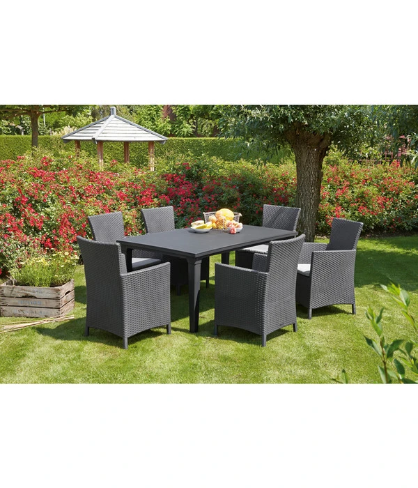 Ihr erklärter Lieblingsort ist Ihr Garten und die Ecke, wo der Rasen so schön von Rosenbeeten umgeben ist bietet sich ideal für eine Gartensitzgruppe an: die Best Möbelgruppe Napoli. Ihr Design verströmt einladendes Landhausflair und lässt die Gedanken in die Toskana wandern. Die Dining-Sessel bezaubern mit tiefgezogenen Rücken- und Seitenteilen in täuschend echter Flechtoptik, die dem typischen, kunstvollen Flachgewebe von Rattanmöbeln ähnelt. Der Tisch präsentiert sich mit einer Tischfläche in dezenter Lattenoptik. Ein harmonisches Ensemble, das schon von weitem Ihr Auge erfreut und mit sechs Sitzplätzen – inklusive passender Sitzkissen – zum gemütlichen Plaudern, geselligen Grill-Runden oder dem nachmittäglichen Treffen mit der besten Freundin einlädt. Sie sollten sich deshalb schnellstmöglich Ihre neue Best Möbelgruppe Napoli nach Hause bringen lassen!