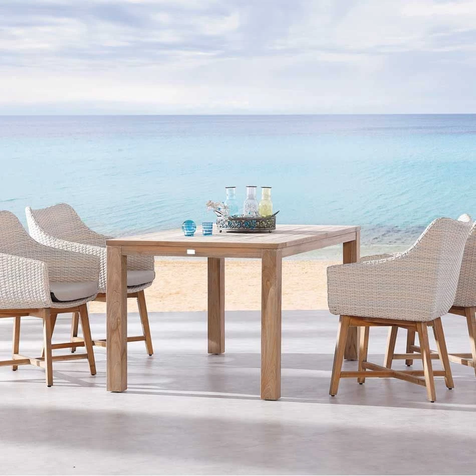 Der Korpus und die Sitzfläche bestehen aus Polyrattan-Geflecht. Die hervorragenden Materialeigenschaften machen das Gestell, das aus Teakholz gefertigt wird, besonders robust und wetterfest. Für ein perfekt stimmiges Gesamtbild sorgt die einheitliche Farbgebung in stilvollem Natur.