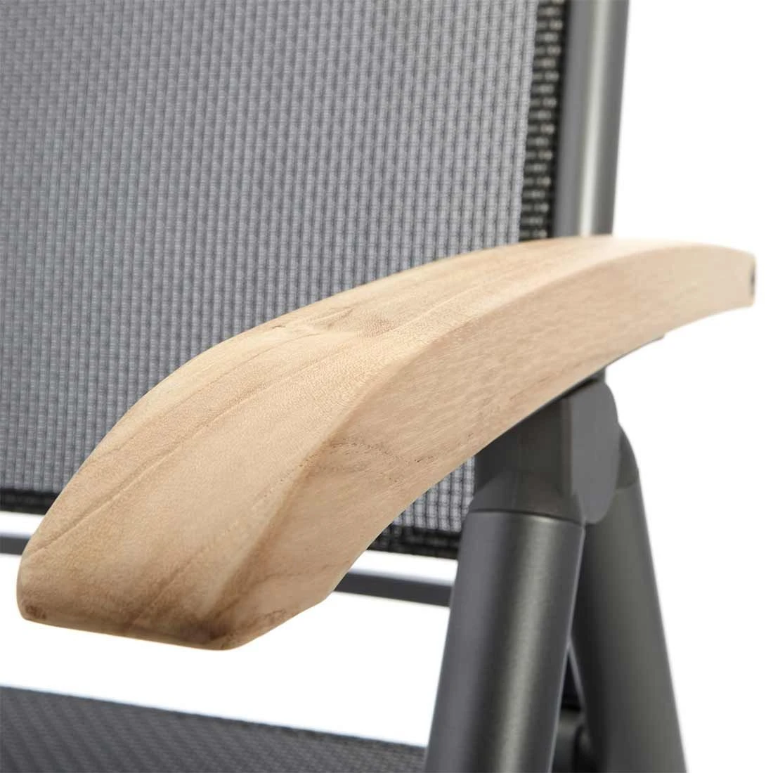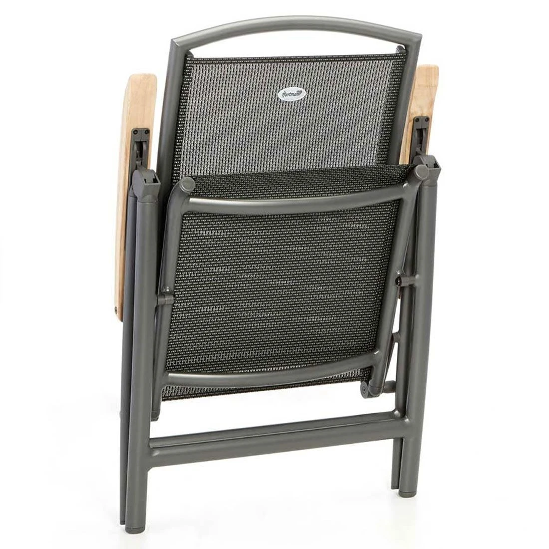Das Gestell besteht aus pflegeleichtem und wetterfestem Aluminium. Für eine attraktive Optik ist das Gestell im Farbton Dunkelgrau gehalten. Für die Bespannung der Sitzfläche verlässt sich der Hersteller auf hochwertiges Textilene. Es zeichnet sich durch eine hohe Robustheit gegenüber Hitze und Frost aus und ist leicht zu reinigen. Damit der Klappsessel optisch ansprechend ist, sind die Sitzfläche und der Bezug im Farbton Anthrazit gehalten.