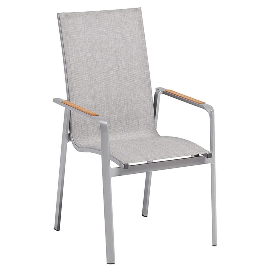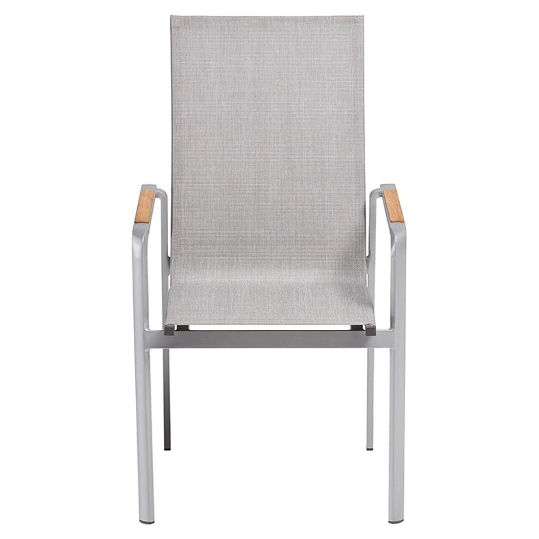 Das Gestell besteht aus pflegeleichtem und wetterfestem Aluminium. Für eine attraktive Optik ist das Gestell im Farbton Silber gehalten. Ein weiterer Pluspunkt des Stapelsessels ist die Bespannung mit Textilene in der Farbe Hellgrau. Dieser Bezugsstoff überzeugt durch eine hohe Robustheit gegenüber Hitze und Frost und ist leicht zu reinigen. Die Sitzfläche ist in ansprechendem Hellgrau gehalten.