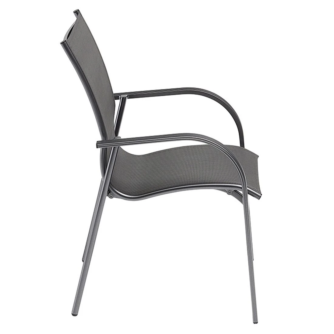 Das Gestell besteht aus pflegeleichtem und wetterfestem Aluminium. Für die Bespannung der Sitzfläche verlässt sich der Hersteller auf hochwertiges Textilene. Es zeichnet sich durch eine hohe Robustheit gegenüber Hitze und Frost aus und ist leicht zu reinigen. Für ein perfekt stimmiges Gesamtbild sorgt die einheitliche Farbgebung in stilvollem Anthrazit.