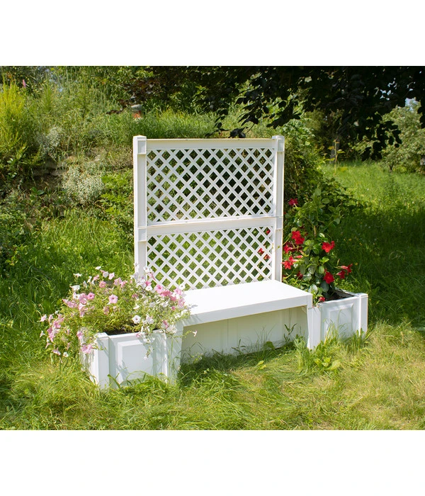 Die KHW Kunststoff-Gartenbank Kopenhagen ist eine stabile und formschöne Gartenbank, die jeden Garten um einiges romantischer und stilvoller macht. Das Set beinhaltet außerdem zwei Pflanzkästen, die Sie individuell mit Ihren Lieblingsblumen befüllen können, und einen Spalier. Damit eignet sich die Gartenbank auch optimal als stimmungsvolle Trennung zwischen zwei Gartenabschnitten oder als besonderer Hingucker in der Mitte Ihrer Grünfläche. Ihre Gäste werden Augen machen! Die Lieferung der KHW Kunststoff-Gartenbank Kopenhagen erfolgt in Einzelteilen, die sich aber einfach und ohne zusätzliches Werkzeug montieren lassen.