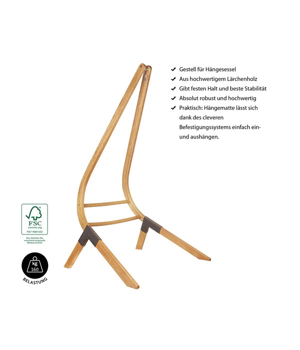 Hergestellt wird der Ständer aus hochwertiger, FSC-zertifizierter Lärche. Durch seine massive Bauweise und spezieller Imprägnierung kann er unbesorgt den ganzen Sommer über draußen im Freien stehen. Die Montage selber ist kinderleicht und besondere Kenntnisse sind hierfür nicht erforderlich. Besonderes praktisch sind das einfache Ein- und Aushängen einer Hängematte dank des cleveren Befestigungssystems. Entscheiden Sie sich noch heute für das La Siesta Hängesesselgestell Calma Nature, um sonnige Tage mit Freude genießen zu können.