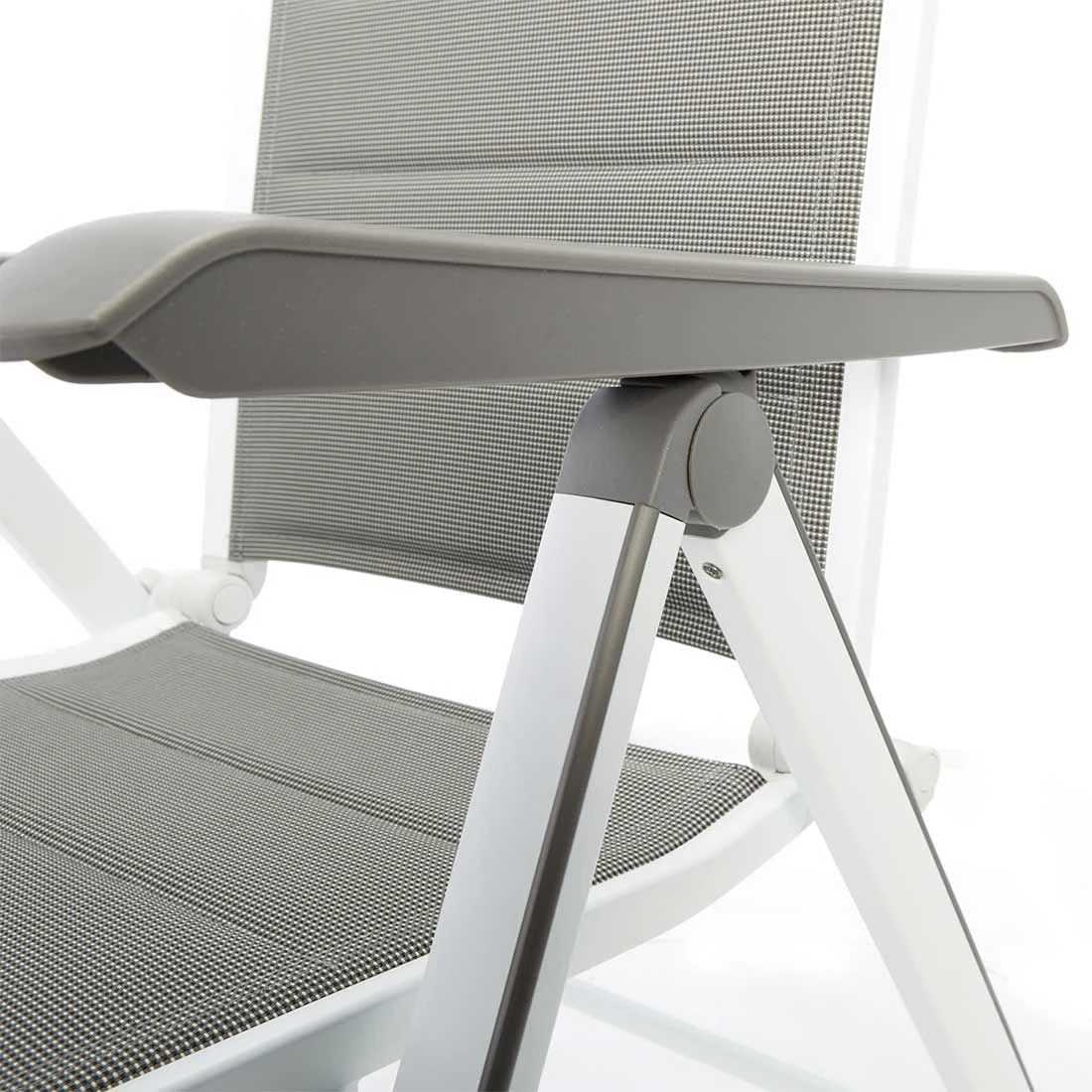 Die Sitzfläche und der Bezug bestehen aus Textilene. Für die Herstellung des Gestells wird hochwertiges und wetterfestes Aluminium verwendet. Für eine attraktive Optik ist das Gestell im Farbton Weiß gehalten. Damit der Klappsessel optisch ansprechend ist, sind die Sitzfläche und der Bezug im Farbton Grau gehalten.