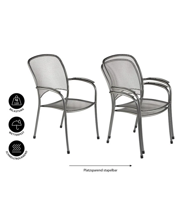 Bei dem MWH Metall-Stapelsessel Carlo handelt es sich, wie der Name schon sagt, um praktische, stapelbare Stühle, die somit bei Nichtbenutzung wenig Platz wegnehmen. Die eisengraue Farbe und das zeitlose Design passen perfekt zu jeder Garten- oder Terrasseneinrichtung. Und auch bei den Polsterfarben ist durch die zurückhaltende Farbe der Stühle eine große Kombinationsmöglichkeit gegeben. Mit dem MWH Metall-Stapelsessel Carlo greifen Sie nicht daneben, wenn Sie Wert auf eine geschmackvolle Einrichtung Ihres Gartens oder Ihrer Terrasse legen.