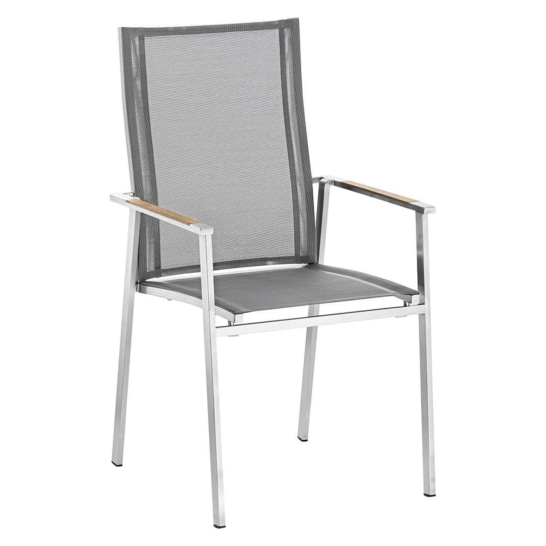 Ein weiterer Pluspunkt des Stapelsessels ist die Bespannung mit Textilene in der Farbe Silbergrau. Dieser Bezugsstoff überzeugt durch eine hohe Robustheit gegenüber Hitze und Frost aus und ist leicht zu reinigen. Die Sitzbreite von 45 cm und die Sitztiefe von 45 cm machen den Stapelsessel besonders komfortabel. Die Sitzhöhe liegt zudem bei angenehmen 46 cm.