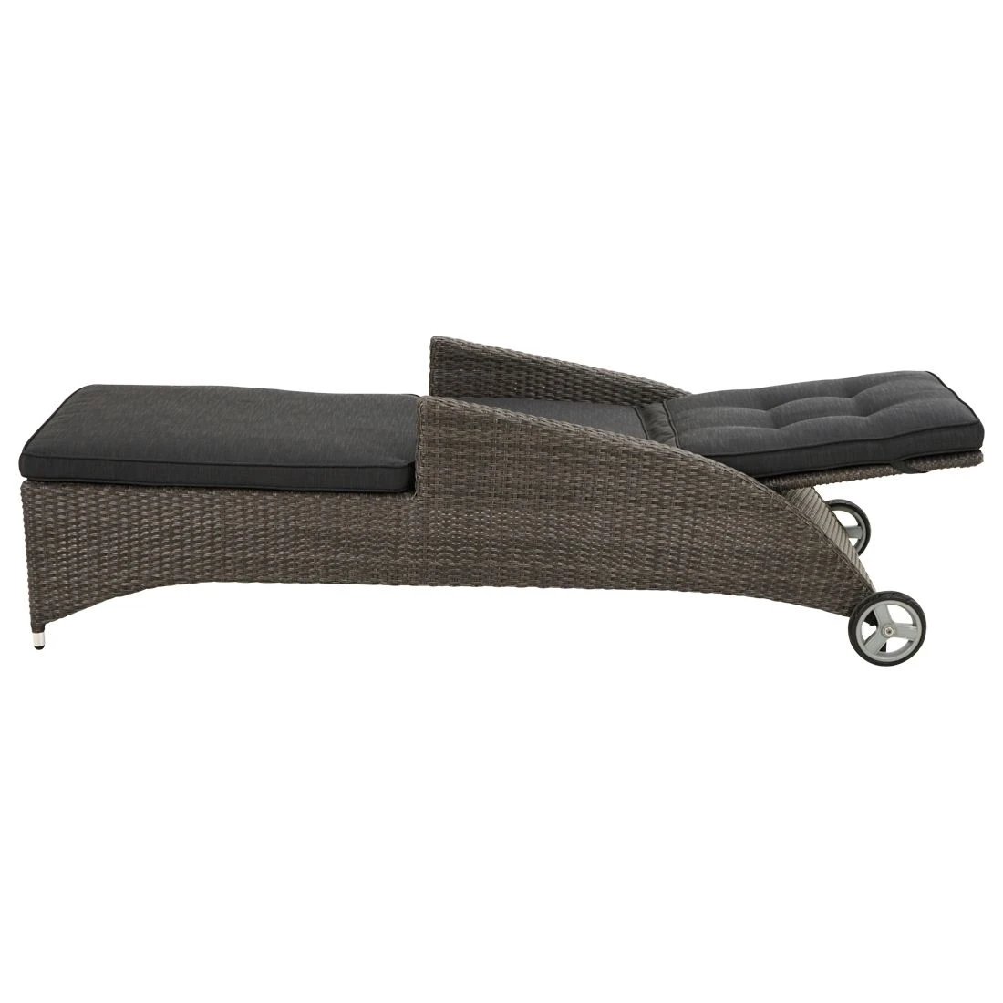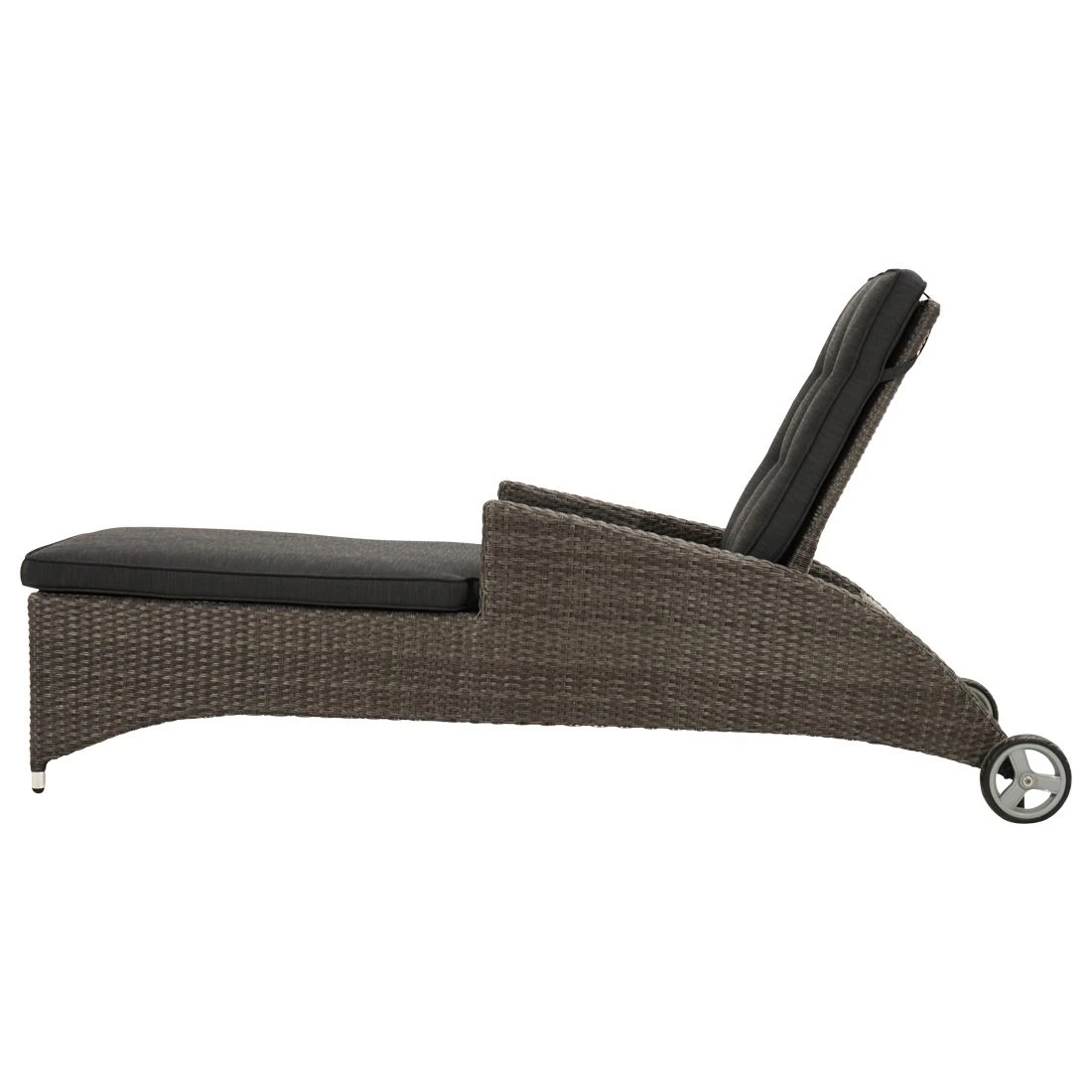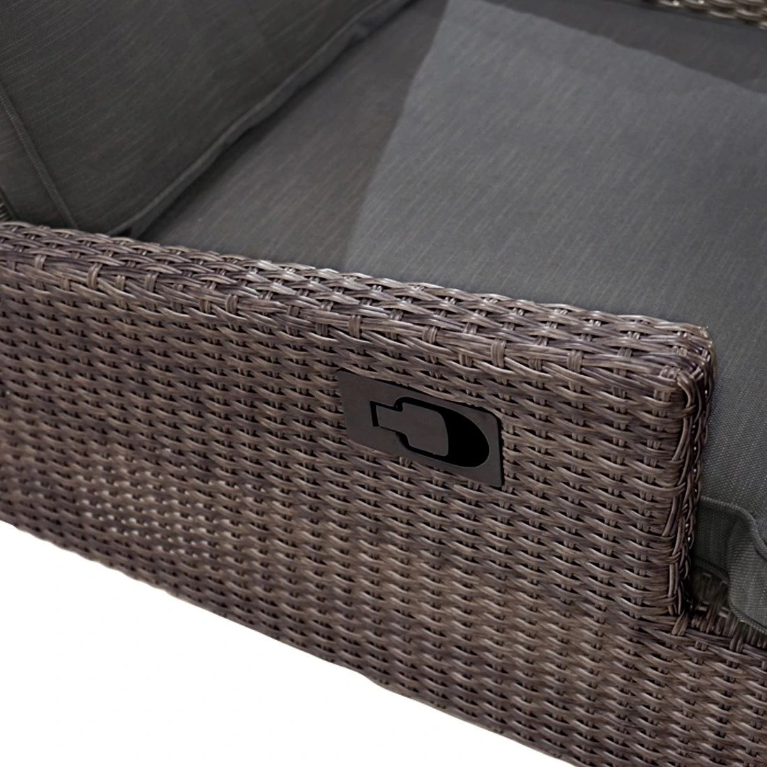 Für die Herstellung des Gestells wird hochwertiges und wetterfestes Aluminium verwendet. Farblich ist dieses in Braun gehalten. Ein hochwertiges Polyrattan-Geflecht umgibt das robuste Gestell und verleiht der Gartenliege damit einen ganz besonderen Look. Als hochwertiges Material für den Bezug kommt ein Polyester-Stoff zum Einsatz. Er ist sehr strapazierfähig und bietet somit die idealen Voraussetzungen für den Einsatz im Freien. Den finalen Schliff erhält diese Gartenliege durch den Bezug in Anthrazit. Damit die Gartenliege optisch ansprechend ist, sind der Korpus und die Sitzfläche im Farbton Grau-Braun-Meliert gehalten.