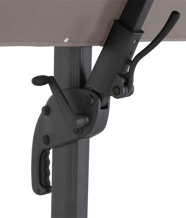 Mit dem Siena Garden Ampelschirm California N+ haben Sie einen echten Allrounder unter den Ampelschirmen entdeckt, der sich in die verschiedensten Richtungen und Stellungen bewegen lässt, so dass Sie bei fast jedem Sonnenstand Schatten finden. Sie können den Schirm mit Hilfe eines Fußpedals um 360° drehen; sie können die Schirmfläche entlang des Masts 8-fach neigen und last but not least können Sie ihn mit einem Hebel beidseitig auch noch um ca. 90° schwenken. Und das mit wenigen Handbewegungen und ohne Kraftaufwand, denn die Bedienung funktioniert mittels Fußpedal und Kurbel.