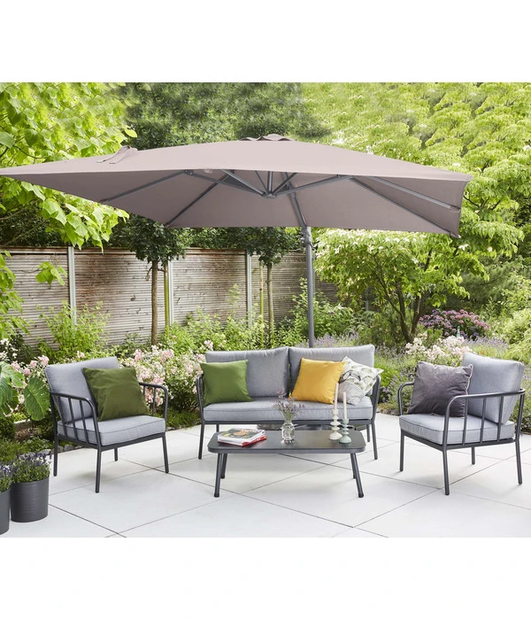 Mit dem Siena Garden Ampelschirm California N+ können wir Ihnen einen Sonnenschirm für gehobene Ansprüche vorstellen. Wie bei klassischen Ampelschirmen üblich, ist der Mast nicht zentral unter dem Schirm angeordnet, sondern an der Seite, so dass Sie den gesamten Platz darunter nutzen können. Und der ist bei diesem Modell besonders groß, denn die Schirmfläche ist 300 x 300 cm groß, so dass Sie Ihren Sitzplatz auf der Terrasse oder die Loungegruppe im Garten perfekt beschatten können. Doch der Sonnenschirm spendet nicht nur angenehmen Schatten und dämpft das grelle Sonnenlicht; mit seinem ausgezeichneten Lichtschutzfaktor 50+ schützt er Sie und Ihre Lieben auch vor den gefährlichen UV-Strahlen. Genießen Sie den Sommer unter freiem Himmel, aber am besten immer unter dem schützenden Dach des Siena Garden Ampelschirm California N+!