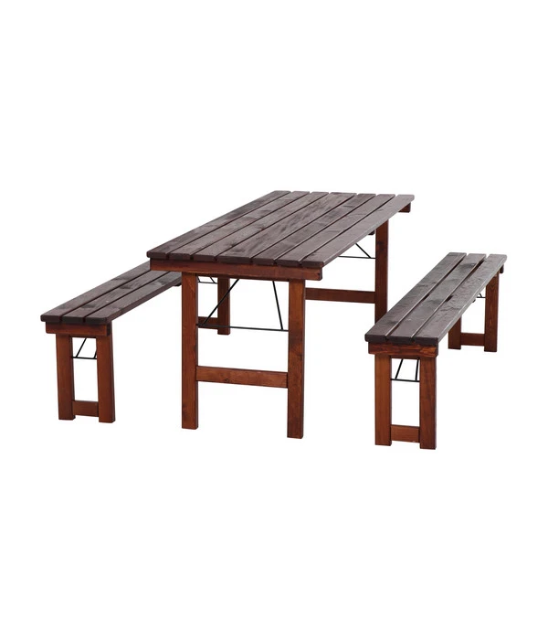 Was macht eigentlich die besondere Ausstrahlung der Sitzgarnitur Wallis aus? Es ist das rustikale Design. Sowohl Tisch als auch BĂ€nke wurden bewusst einfach und in typischer Lattenoptik gestaltet. Aber das ist nicht alles. Der spezielle, urige Charme der Sitzgruppe entsteht durch die dunkle Lasur, mit der das Kiefernholz behandelt wurde. Dank ihrer Schlichtheit harmoniert die Garnitur mit den unterschiedlichsten Einrichtungsstilen und ist auf Terrasse, Balkon oder Garten eine Bereicherung.