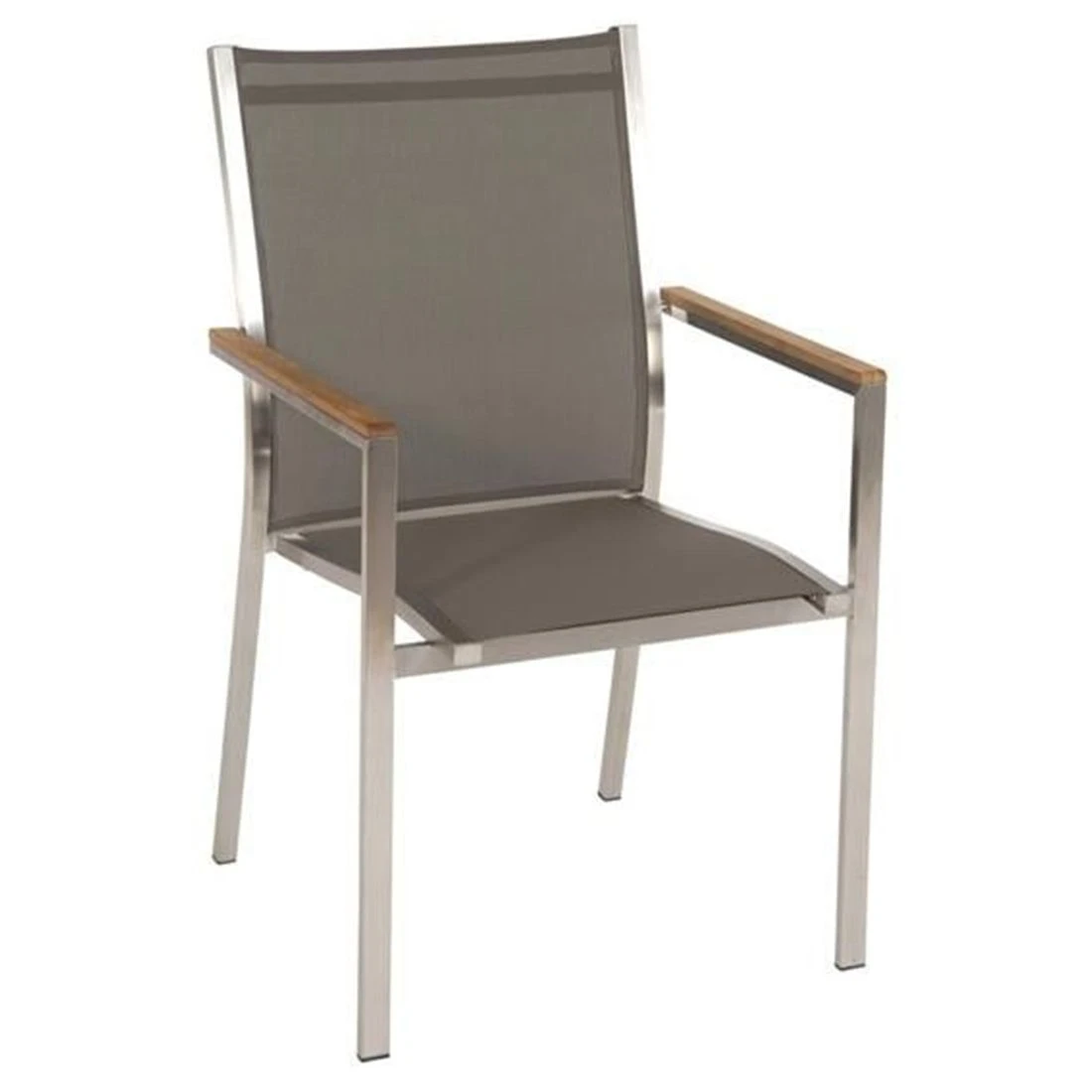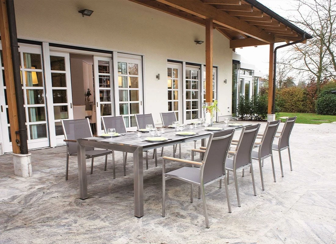 Die robusten Edelstahlgestelle sorgen für eine hohe Stabilität und Tragfähigkeit. Darüber hinaus begeistern diese mit einem zeitlos eleganten Look. Ein der Sitzmöbel ist die Bespannung der Sitzflächen mit Textilene. Dieses Material zeichnet sich durch eine hohe Robustheit gegenüber Hitze und Frost aus und ist leicht zu reinigen.