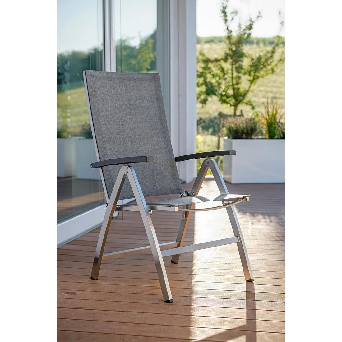 Das Gestell wird aus hochwertigem und rostfreiem Edelstahl hergestellt. Aufgrund des etwas höheren Eigengewichts, steht der Klappsessel dadurch besonders stabil und windsicher auf der Terrasse. Für die Bespannung der Sitzfläche verlässt sich der Hersteller auf hochwertiges Textilene. Es zeichnet sich durch eine hohe Robustheit gegenüber Hitze und Frost aus und ist leicht zu reinigen. Seine Klappbarkeit ermöglicht es, den Klappsessel kompakt bei Nicht-Benutzung oder im Winter einzulagern. Die Sitzbreite von 50 cm und die Sitztiefe von 45 cm machen den Klappsessel besonders komfortabel. Die Sitzhöhe liegt zudem bei angenehmen 45 cm.